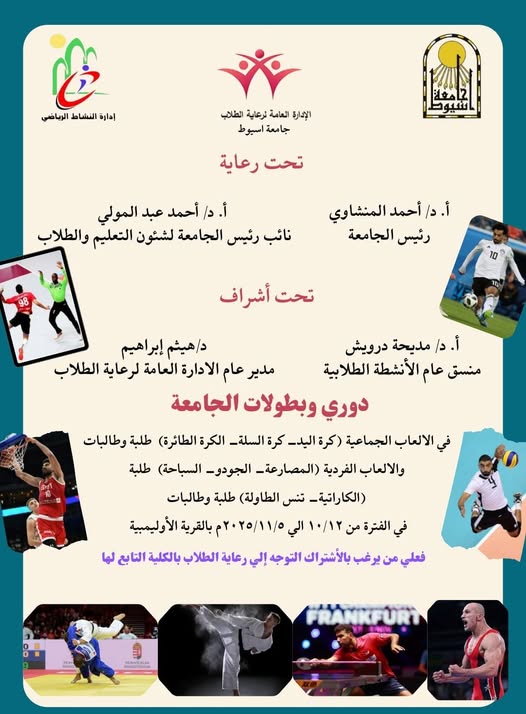 دعوة لمشاركة الطلاب والطالبات بكليات الجامعة المختلفة في دوري وبطولات الجامعة في الألعاب الجماعية والألعاب الفردية - أدارة النشاط الرياضى بالإدارة العامة لرعاية الطلاب