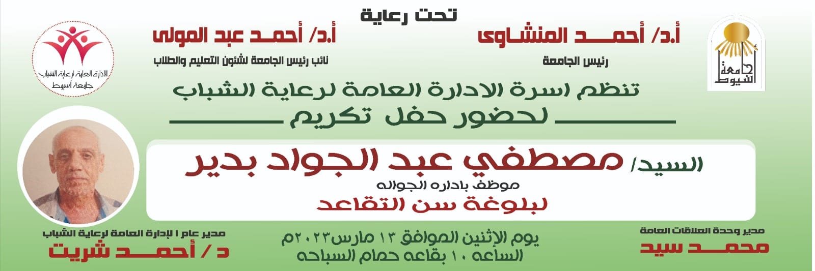 دعوة ...يسعدنا تشريفكم يوم الإثنين الموافق ١٣ مارس الساعة ١٠ صباحا بقاعة حمام السباحة استاد جامعة اسيوط 12 مارس 2023 دعوة ...يسعدنا تشريفكم يوم الإثنين الموافق ١٣ مارس الساعة ١٠ صباحا بقاعة حمام السباحة استاد جامعة اسيوط