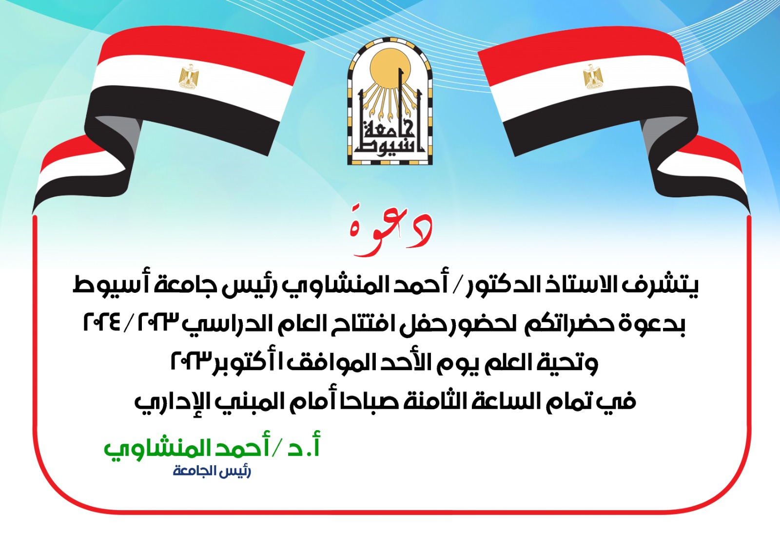 دعوة  يتشرف الاستاذ الدكتور / أحمد المنشاوى رئيس جامعة اسيوط بدعوة حضراتكم لحضور حفل افتتاح العام الدراسى 2023/2024 وتحية العلم يوم الاحد الموافق 1 اكتوبر 2023 فى تمام الساعة الثامنة صباحا امام المبنى الادارى