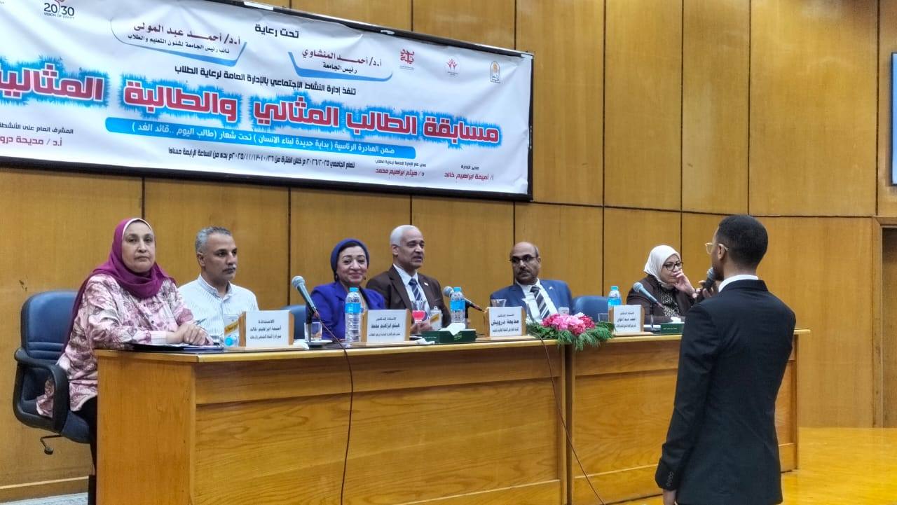 فاعليات اليوم الثالث من المرحلة التمهدية من مسابقة الطالب والطالبة المثاليين على مستوى كليات الجامعة بقاعة المناقشات بالمبنى الإدارى - إدارة النشاط الاجتماعي والرحلات بالإدارة العامة لرعاية الطلاب