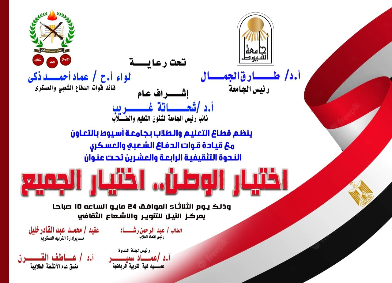 أعلن الدكتور طارق الجمال رئيس جامعة أسيوط عن انعقاد غداً الثلاثاء 24 مايو الندوة التثقيفية الرابعة والعشرين والتى ينظمها قطاع التعليم والطلاب بالجامعة بالتعاون مع قيادة قوات الدفاع الشعبى والعسكرى وذلك تحت عنوان " اختيار الوطن... اختيار الجميع " وذلك بحضور اللواء أركان حرب عماد أحمد ذكى قائد قوات الدفاع الشعبي والعسكرى وكذلك القيادات الشعبية والأمنية والتنفيذية وقيادات العمل الأكاديمى والأنشطة الطلابية وحشد من أبناء الجامعة من مختلف الكليات وذلك بمركز النيل للتنوير والإشعاع الثقافى .