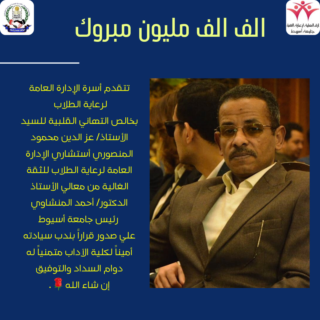 خالص التهاني القلبية للسيد عزالدين محمود المنصوري بثقة معالي الاستاذ الدكتور احمد المنشاوي رئيس الجامعة وندبه أميناً لكلية الآداب بجامعة أسيوط 30 مايو 2024 مناقشة رسالة الدكتوراه المقدمة من / محمد حسب النبي عبد العال - قسم الفيزياء