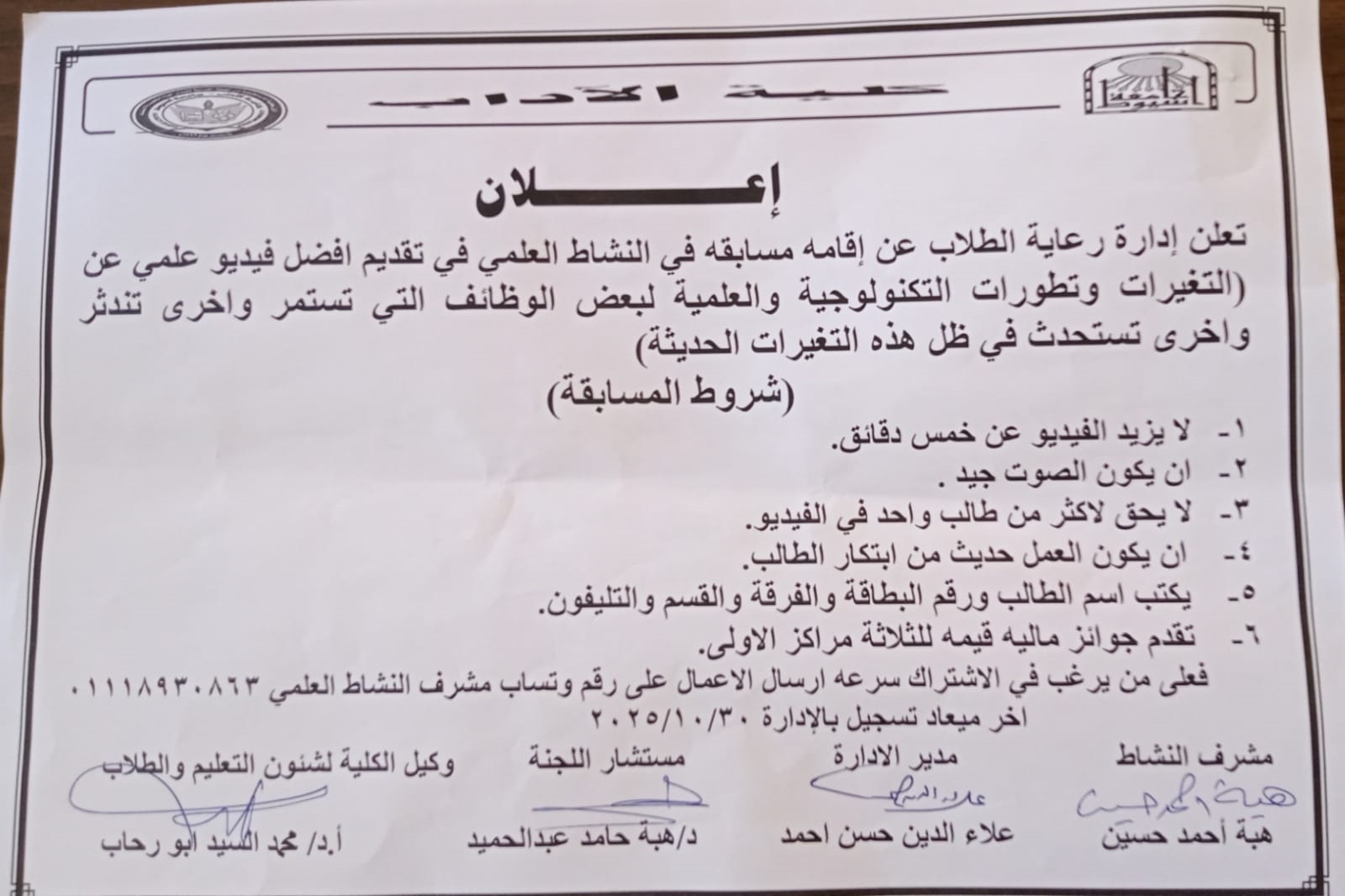 كلية الأداب- اعلان عن اقامة مسابقة تقديم افضل فيديو علمي 5 أكتوبر 2025 تهنئة بمناسبة حلول عيد الفطر المبارك