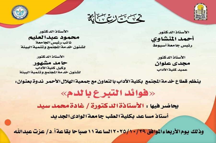 كلية الاداب- ينظم قطاع خدمة المجتمع بالكلية بالتعاون مع جمعية الهلال الاحمر ندوة بعنوان (فوائد التبرع بالدم) 28 أكتوبر 2025 تحتفل كلية العلوم " بيوم العلوم وتكريم الخريجين " الدفعة السادسة والخمسون والسابعة والخمسون وذلك يوم الخميس الموافق 2017/5/11م بمدرج 3 بالكلية في تمام الساعة العاشرة صباحا