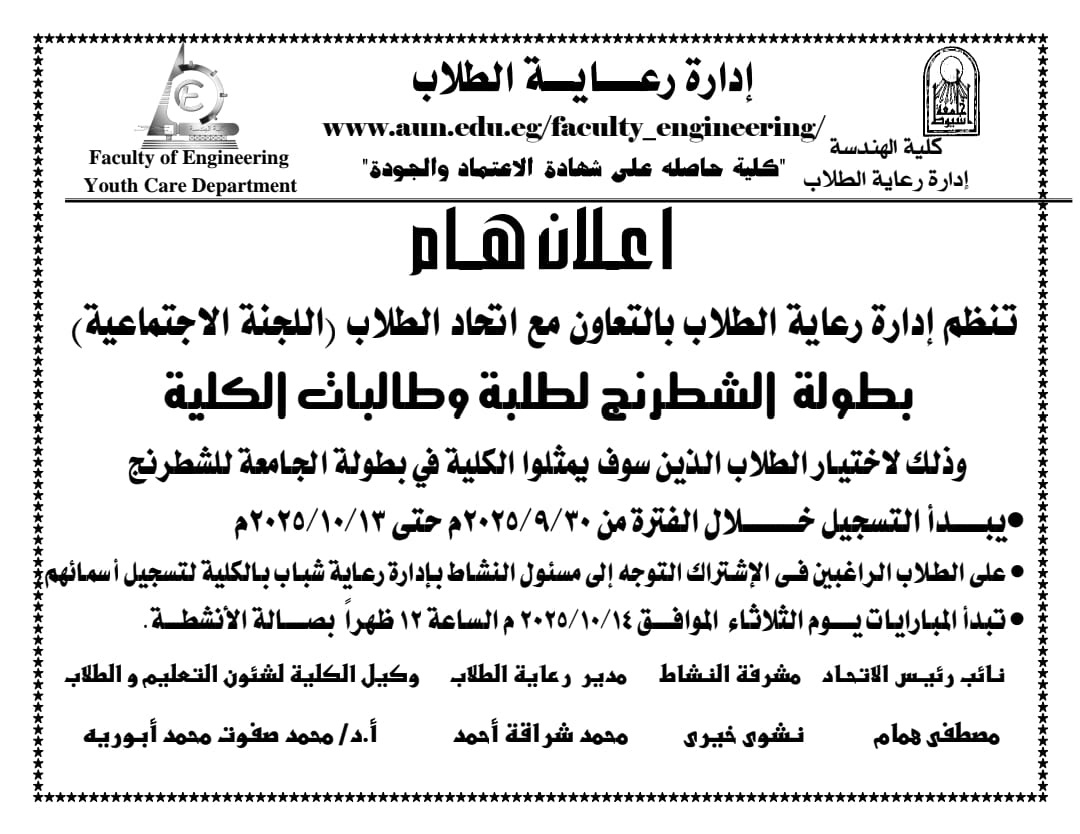 كلية الهندسة- اعلان عن بطوله الشطرنج لطلبة وطالبات الكلية 6 أكتوبر 2025 دعوة العاملين لانتخاب ممثل عن جامعة أسيوط بصندوق تحسين العاملين وكشف بأسماء المرشحين