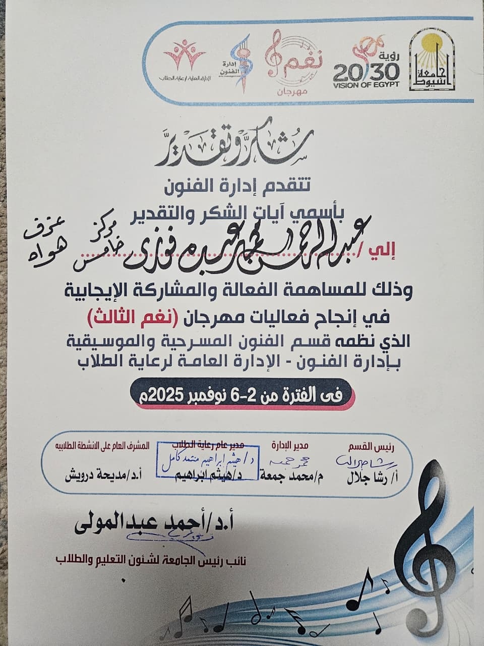 كلية الهندسة-مشاركة طلبه وطالبات الكلية فى فعاليات مهرجان " نغم الثالث " لاكتشاف المواهب الطلابية في مجال ( العزف _ الغناء _ الانشاد الديني ) 9 نوفمبر 2025 تم مد فترة الاستبيان الالكتروني حتي الخميس الموافق 2016/12/29 م علما بان الموقع يعمل في مواعيد العمل الرسمية من الساعة الثامنة صباحا الي الثانية بعد الظهر