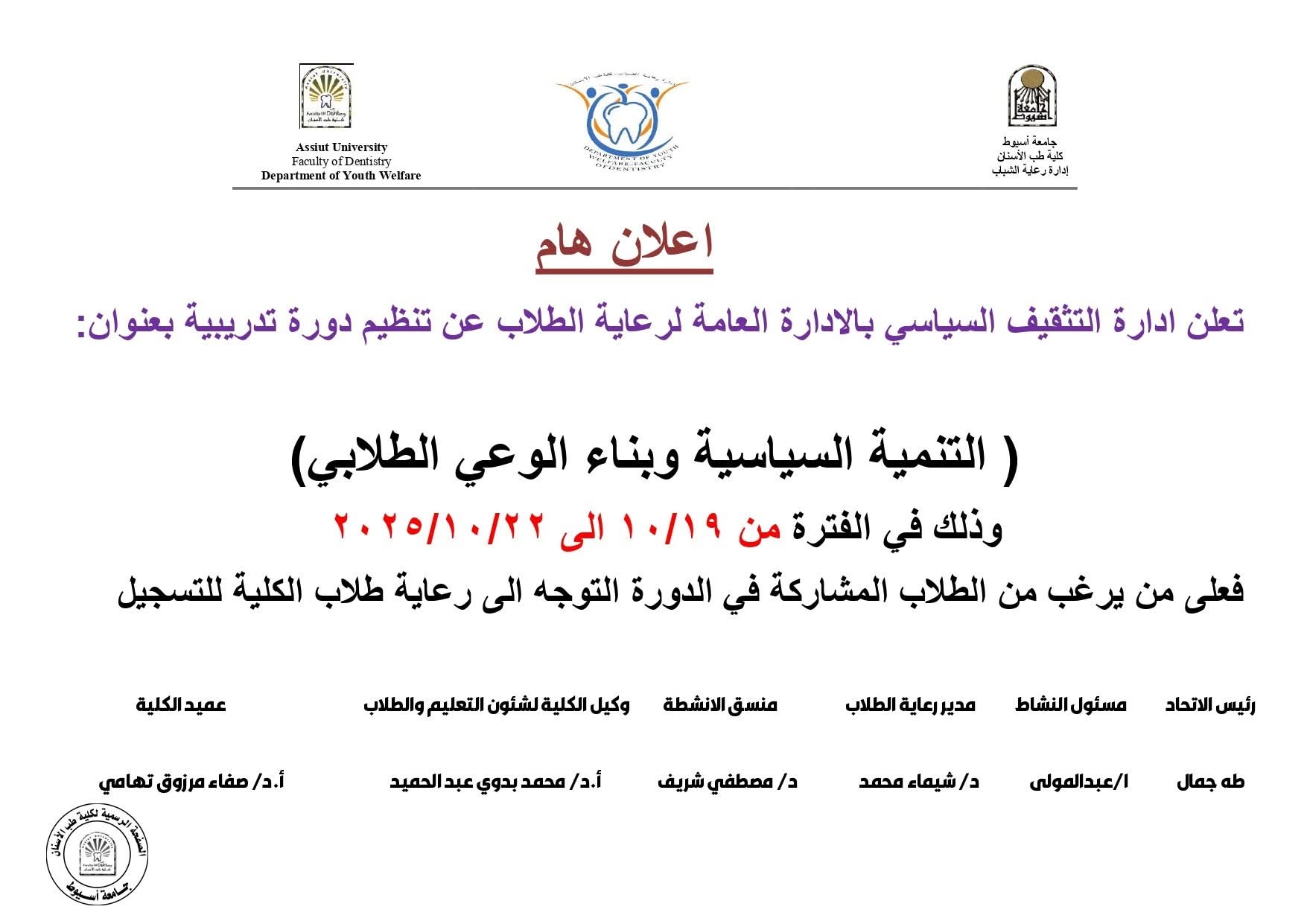 كلية طب الاسنان- الاعلان عن دورة تدريبية بعنوان التنمية السياسية وبناء الوعي الطلابي في الفترة من 19 اكتوبر حتي 22 اكتوبر