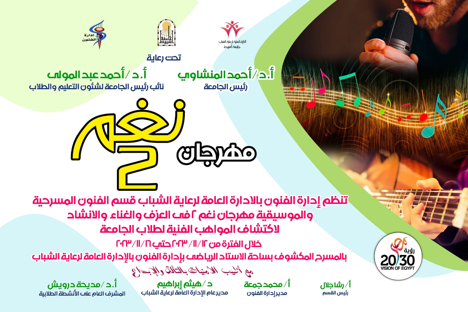 " مهرجان نغم 2 " .. تنظم إدارة الفنون بالإدارة العامة لرعاية الشباب قسم الفنون المسرحية والموسيقية مهرجان نغم 2 فى العزف والغناء والانشاد لاكتشاف المواهب الفنية لطلاب الجامعة خلال الفترة من 12 نوفمبر 2023 حتى 16 نوفمبر 2023  بالمسرح المكشوف بساحة الاستاد