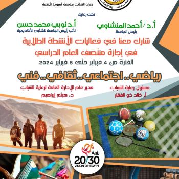 إدارة الاتحادات الطلابية وإدارة اعداد القادة بالتعاون مع اتحاد طلاب الجامعة وأسرة طلاب من أجل مصر برنامج قادة -وقيادة -قادة من أجل مصر خلال أجازة نصف العام في الفترة من ٣ فبراير حتي ٧ فبراير ٢٠٢٤