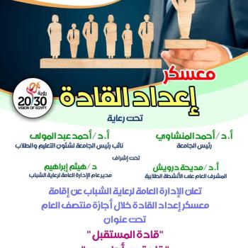 ادارة اعداد القادة ورعاية المتميزين بالادارة العامة لرعاية الشباب .. تعلن عن إقامة معسكر إعداد القادة خلال أجازة منتصف العام تحت عنوان " قادة المستقبل " " قادة من أجل مصر "