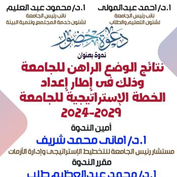 جامعة أسيوط تنظم ندوة حول "نتائج الوضع الراهن للجامعة وذلك في إطار إعداد الخطة الإستراتيجية للجامعة 2024-2029.