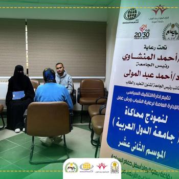 ادارة التثقيف السياسي بالادارة العامة لرعاية الشباب .. بداية الموسم الثاني عشر لنموذج محاكاة جامعة الدول بجامعة اسيوط واعلان الدرع القوي من مقاتلين الصفوف الاولي ثلاثي النواب لرئيس النموذج .