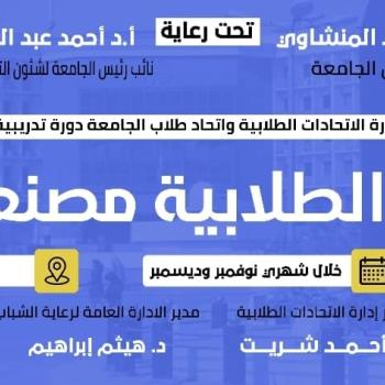 إدارة الاتحادات الطلابية بالإدارة العامة لرعاية الشباب.. دعوة لمشاركة جميع الطلاب في دورة تدريبية عن " الاتحادات الطلابية مصنع القيادات " وذلك ايام الثلاثاء والاربعاء الساعة ٢ ظهرا خلال شهري نوفمبر و ديسمبر بقاعة بهو الرواد بالقرية الاوليمبية