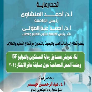 ينظم قطاع الدراسات العليا والبحوث بالتعاون مع قطاع التعليم والطلاب لقاء تعريفى بصندوق رعاية المبتكرين والنوابغ ISF وجلسة العمل المصاحبة حول مسابقة حافز الابتكار 2024 ويحاضر فيها الاستاذ الدكتورعبد الرحمن حيدر منسق صندوق رعاية المبتكرين والنوابغ