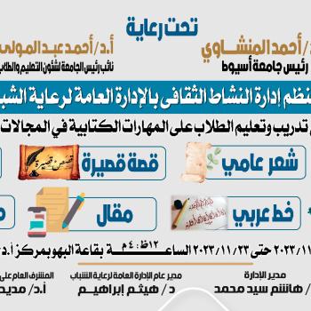 تنظم إدارة النشاط الثقافي بالإدارة العامة لرعاية الشباب ورش تدريب وتعليم الطلاب على المهارات الكتابية في المجالات الآتية " شعر فصحي - شعر عامي - قصة قصيرة - رواية - تأليف مسرحي - خط عربي - مقال - مجلات الحائط خلال الفترة من ١٢ نوفمبر ٢٠٢٣ حتى ٢٣ نوفمبر