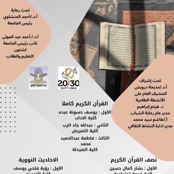 إدارة النشاط الثقافي بالادارة العامة لرعاية الشباب .. تعلن عن الطلاب الفائزين فى المسابقة الروحية للقرأن الكريم والاحاديث النووية