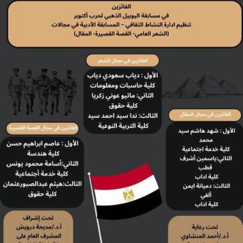 ادارة النشاط الثقافى .. تعلن عن الطلاب الفائزون فى مسابقة اليوبيل الذهبى لحرب اكتوبر فى مجالات " الشعر العامى - القصة القصيرة - المقال"