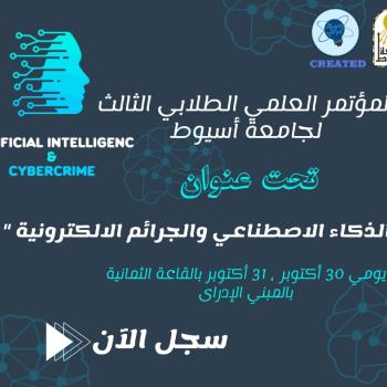 إدارة النشاط العلمى والتكنولوجى بالادارة العامة لرعاية الشباب ...تعلن عن المؤتمر العلمى الطلابى الثالث لجامعة أسيوط تحت عنوان " الذكاء الاصطناعى والجرائم الإلكترونية " خلال يومى ٣٠ و٣١ أكتوبر بالقاعة الثمانية بالمبنى الاداري للجامعة