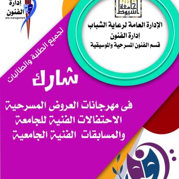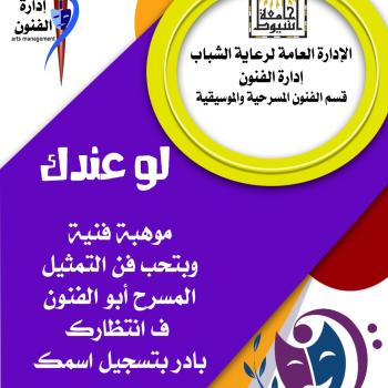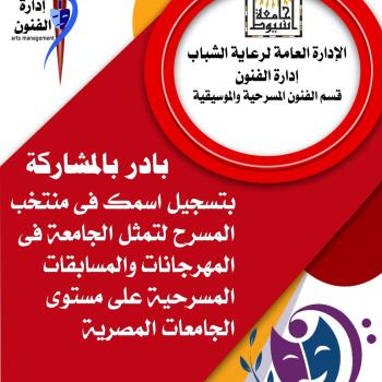 إدارة الفنون بالإدارة العامة لرعاية الشباب قسم الفنون المسرحية والموسيقية .. عزيزى الطالب بادر بالمشاركة بتسجيل اسمك فى منتخب المسرح لتمثل الجامعة في المهرجانات والمسابقات المسرحية على مستوى الجامعات المصرية