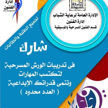 الإدارة العامة لرعاية الشباب إدارة الفنون قسم الفنون المسرحية والموسيقية ... عزيزى الطالب شارك فى تدريبات الورش المسرحية لتكتسب المهارات وتنمي قدراتك الإبداعية (العدد محدود)