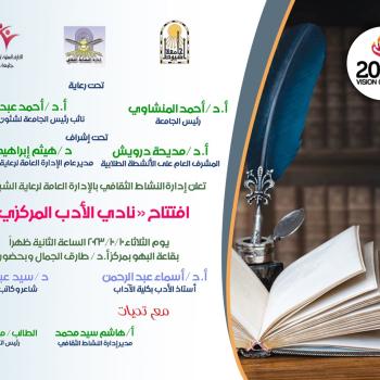 إدارة النشاط الثقافي بالادارة العامة لرعاية الشباب .. افتتاح " نادي الادب المركزي " في أنتظاركم يوم الثلاثاء الموافق 10 اكتوبر 2023م بقاعة البهو بالقرية الأولمبية الساعة الثانيه ظهرا