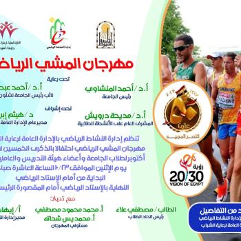 ادارة النشاط الرياضي بالادارة العامة لرعاية الشباب .. دعوة لحضور " مهرجان المشي الرياضي " وذلك احتفالا بالذكري ال 50 عاما لانتصارات أكتوبر المجيدة يوم الإثنين الموافق ٢٣ أكتوبر الساعة العاشرة صباحا من أمام الإستاد الرياضى