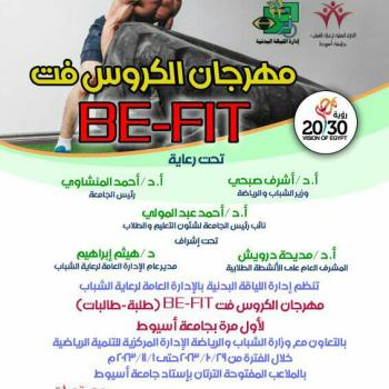 ادارة اللياقة البدنية بالادارة العامة لرعاية الشباب ..تنظم مهرجان الكروس فت BE- FIT ( طلبة - طالبات ) لاول مرة بجامعة اسيوط بالتعاون مع وزارة الشباب والرياضة الادارة المركزية التنمية الرياضية خلال الفترة من 29 اكتوبر 2023 وحتى 1 نوفمبر 2023 م