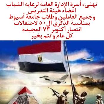 تهنئة .. تهنىء اشرى الادارة العامة لرعاية الشباب السادو اعضاء هيئة اتدريس والعاملين وطلاب جامعة اسيوط بمناسبة الذكرى ال 50 لاحتفالات انتصار اكتوبر العظيم