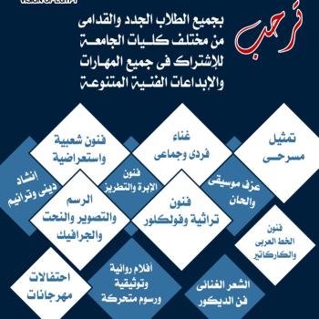 ترحب ادارة الفنون بجميع الطلاب الجدد والقدامى من مختلف كليات الجامعة للاشتراك فى جميع المهارات والابداعات الفنية المتنوعة