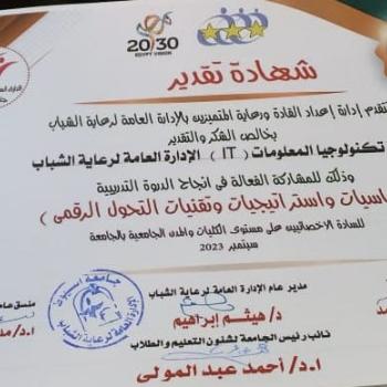 شهادة تقدير مقدمة الى وحدة تكنولوجيا المعلومات I.T رعاية الشباب المركزية