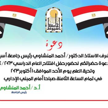 دعوة يتشرف الاستاذ الدكتور / أحمد المنشاوى رئيس جامعة اسيوط بدعوة حضراتكم لحضور حفل افتتاح العام الدراسى 2023/2024 وتحية العلم يوم الاحد الموافق 1 اكتوبر 2023 فى تمام الساعة الثامنة صباحا امام المبنى الادارى