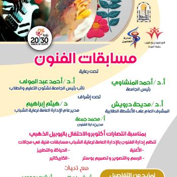 اعلان هام .. إدارة الفنون ... بمناسبة انتصارات اكتوبر والاحتفال باليوبيل الذهبي تعلن الادارة العامة لرعاية الشباب لطلاب جامعة اسيوط عن مسابقات الفنون فى مجالات " الاغنية . الرسم والتصوير وتصميم البوستر . الكاريكاتير . الحياكة والتطريز "