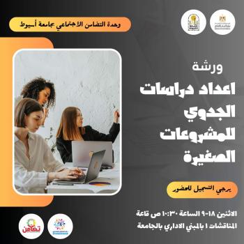 مبادرة الطالب المنتج ... جلسة بعنوان " اعداد دراسات الجدوي للمشروعات الصغيرة" والتي نظمتها وحدة التضامن الإجتماعى بجامعة اسيوط فى تمام الساعة الحادية عشر صباحا بقاعة المناقشات رقم ١ بالمبني الاداري بالجامعة وذلك في ضوء مبادرة الطالب المنتج