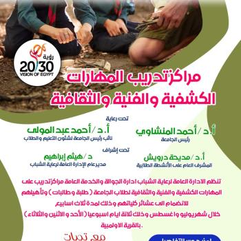 إدارة النشاط الثقافي ... دعوة لجميع طلاب جامعة اسيوط للمشاركة فى الانشطة الطلابية خلال الاجازة الصيفية , بادر بتسجيل اسمك بالإدارة العامة لرعاية الشباب " استاد الجامعة الرياضي "
