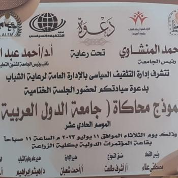 إدارة التثقيف السياسي ... دعوة لحضور الجلسة الختامية لنموذج محاكاة جامعة الدول العربية الموسم الحادي عشر للعام الجامعي 2022 /2023 م غدا الثلاثاء 11 يوليو 2023 بقاعة المؤتمرات الدولية بكلية زراعة الساعة 11 صباحا