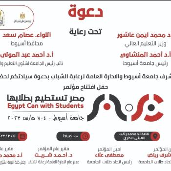 دعوة .. الادارة العامة لرعاية الشباب المركزية بجامعة اسيوط - تدعوكم لحفل افتتاح "مؤتمر مصر تستطيع بطلابها "علي مستوي الجامعات المصرية غدا الأحد الموافق ٥ مارس الساعة التاسعة والنصف صباحا بقاعة الأستاذ الدكتور محمد رافت محمود بالمبني الاداري للجامعة