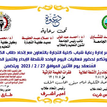 ادارة رعاية الشباب بكلية التجارة بالتعاون مع اتحاد طلاب الكلية تدعوكم لحضور فعاليات اليوم الواحد لانشطة الابداع والتميز الطلابي وذلك يوم الاثنين الموتفق 27 فبراير 2023 م