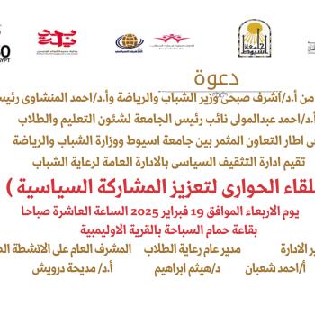 ادارة التثقيف السياسي بالادارة العامة لرعاية الطلاب .. يسرنا أعزائي الطلاب دعوتكم للمشاركة في اللقاء الحوارى لطلاب جامعة أسيوط وذلك يوم الأربعاء الموافق ١٩ فبراير ٢٠٢٥ بقاعة حمام السباحة بالقرية الأولمبية الساعة التاسعة والنصف صباحا