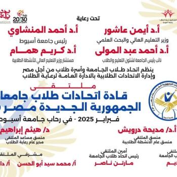 ينظم إتحاد طلاب الجامعة وأسرة طلاب من أجل مصر وإدارة الاتحادات الطلابية بالإدارة العامة لرعاية الطلاب ملتقى قادة أتحادات طلاب جامعات الجمهورية الجديدة مصر ٢٠٣٠م فبراير ٢٠٢٥م فى رحاب جامعة أسيوط