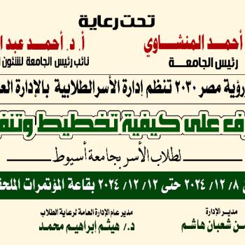 إدارة الاسر الطلابية بالادارة العامة لرعاية الطلاب .. تنظم البرنامج التدريبى للتعرف على كيفية تخطيط وتنفيذ المبادرات المجتمعية لطلاب الاسر بجامعة أسيوط خلال الفترة من 8 ديسمبر 2024 الى 12 ديسمبر 2024 م بقاعة المؤتمرات الملحقة بكليه الزراعة