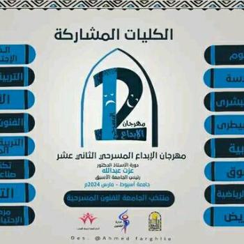إدارة الفنون .... قسم الفنون المسرحية والموسيقية .... اليوم انطلاق مهرجان المسرح " الإبداع المسرحى الثانى عشر " لطلبة وطالبات فرق الفنون المسرحية بكليات جامعة أسيوط وذلك خلال الفترة من ٣ حتي ٧ مارس ٢٠٢٤م بمسرح مركز النيل للتنوير والاشعاع الثقافى