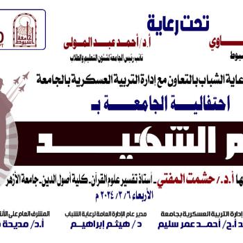 تنظم الادارة العامة لرعاية الشباب بالتعاون مع إدارة التربية العسكرية بالجامعة إحتفالية الجامعة بيوم الشهيد يحاضر فيها الاستاذ الدكتور حشمت المفتى أستاذ تفسير علوم القرأن كلية أصول الدين جامعة الازهر وذلك يوم الاربعاء 6 مارس 2024