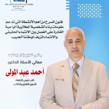 ادارة الفنون ... مهرجان الإبداع المسرحي الثاني عشر دورة أ.د / عزت عبد الله رئيس الجامعة الأسبق جامعة أسيوط - مارس ٢٠٢٤م راعي المهرجان وداعمه معالى الأستاذ الدكتور أحمد عبد المولى نائب رئيس الجامعة لشئون التعليم والطلاب