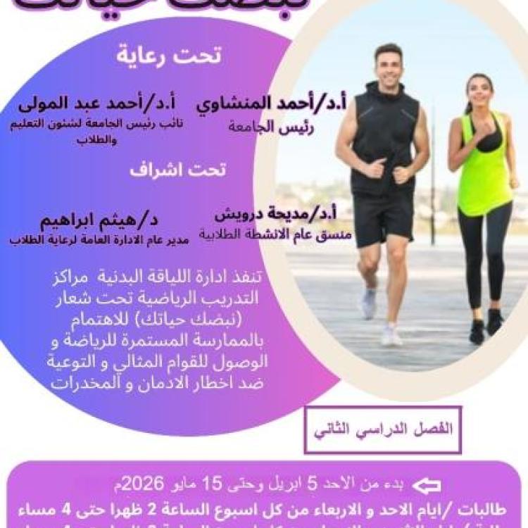 إدارة اللياقة البدنية بالإدارة العامة لرعاية الطلاب - تنفذ الإدارة مراكز التدريب الرياضية تحت شعار ( نبضك حياتك) للإهتمام بالممارسة المستمرة للرياضة والوصول للقوام المثالي والتوعية ضد أخطار الإدمان والمخدرات