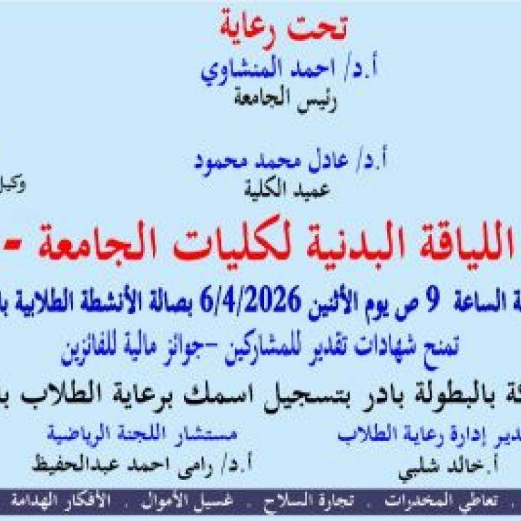 كلية الزراعة ... تنظم ادارة رعاية الطلاب واتحاد طلاب الكلية بطولة اللياقة البدنية على مستوى كليات الجامعة وذلك يوم الاتنين الموافق 6/4/2026