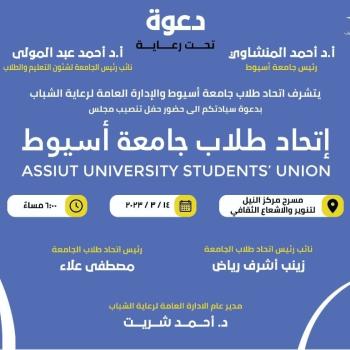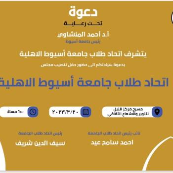 دعوة للحضور . .. حفل تنصيب مجلس اتحاد طلاب جامعة اسيوط الاهلية يوم الإثنين الموافق ٢٠ مارس بقاعة مسرح مركز النيل للتنوير والاشعاع الثقافي الساعه ٦ مساءا