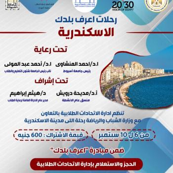 إدارة الاتحادات الطلابية بالإدارة العامة لرعاية الطلاب .. تنظم جامعة اسيوط رحلات أعرف بلدك بالتعاون مع وزارة الشباب والرياضة إلي محافظة الاسكندريةخلال الفترة من 6 الى 10 سبتمبر ضمن مبادرة "اعرف بلدك"