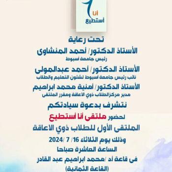 الثلاثاء القادم ... ملتقى جامعة أسيوط الأول لطلاب ذوى الإعاقة "أنا أستطيع"