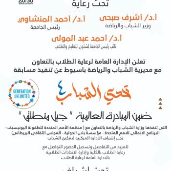 إدارة الاتحادات الطلابية بالإدارة العامة لرعاية الطلاب دعوة لمشاركة الطلاب والطالبات في مسابقة( تحدي الشباب ٤ )ضمن المبادرة العالمية " جيل منطلق " التي تنفيذها وزارة الشباب والرياضة بالتعاون مع ( منظمة الأمم المتحدة للطفولة اليونيسيف - البرنامج الانمائى