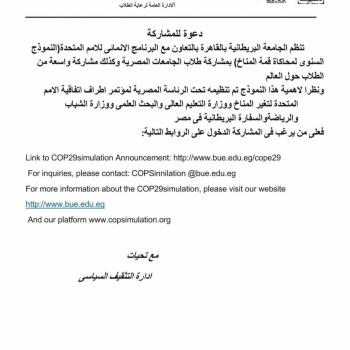 إدارة التثقيف السياسى .... تنظم الجامعة البريطانية بالقاهرة بالتعاون مع البرنامج الإنمائي للأمم المتحدة (النموذج السنوي لمحاكاة قمة المناخ) بمشاركة طلاب الجامعات المصرية وكذلك مشاركة من الطلاب حول العالم.